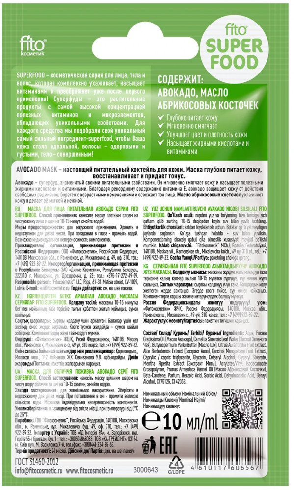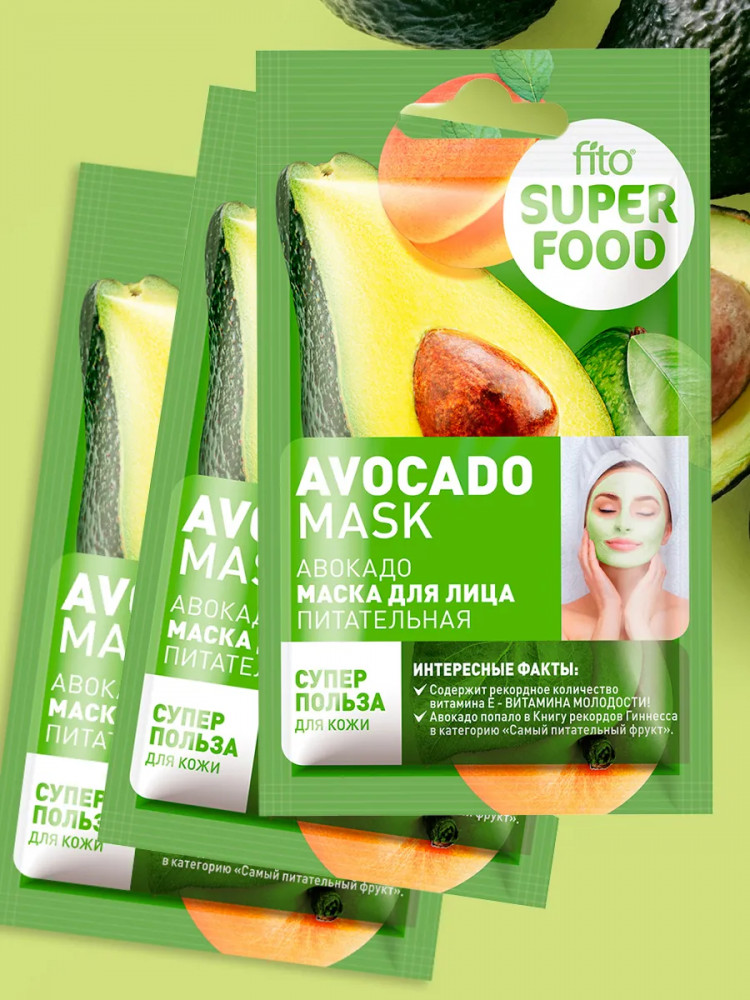 Фитокосметик Маска для лица питательная «Авокадо»В данный момент этот товар отсутствует в продаже. Возможно, у нас найдется аналогичный или похожий товар здесь. Avocado mask — настоящий питательный коктейль для кожи. Маска глубоко питает кожу, восстанавливает и придает тонус. Авокадо — суперфуд, знаменитый своими питательными свойствами. Он мгновенно смягчает кожу и насыщает полезными жирными кислотами и витаминами. Благодаря рекордному содержанию витамина Е, авокадо защищает кожу от действия свободных радикалов, борется с возрастными изменениями и освежает тон лица. Масло абрикосовых косточек увлажняет кожу и делает её мягкой и нежной. |