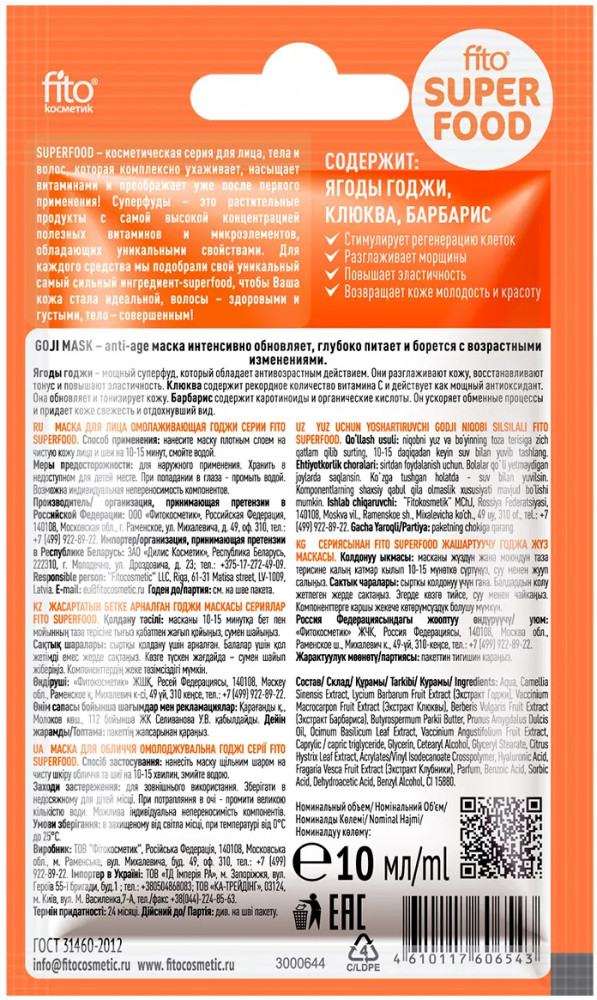 Фитокосметик Маска для лица омолаживающая «Годжи»консистенция запах В данный момент этот товар отсутствует в продаже. Возможно, у нас найдется аналогичный или похожий товар здесь. Goji mask — anti-age маска интенсивно обновляет, глубоко питает и борется с возрастными изменениями. Ягоды годжи — мощный суперфуд, который обладает антивозрастным действием. Они разглаживают кожу, восстанавливают тонус и повышают эластичность. Клюква содержит рекордное количество витамина C и действует как мощный антиоксидант. Она обновляет и тонизирует кожу. Барбарис содержит каротиноиды и органические кислоты. Он ускоряет обменные процессы и придает коже свежесть и отдохнувший вид. |
