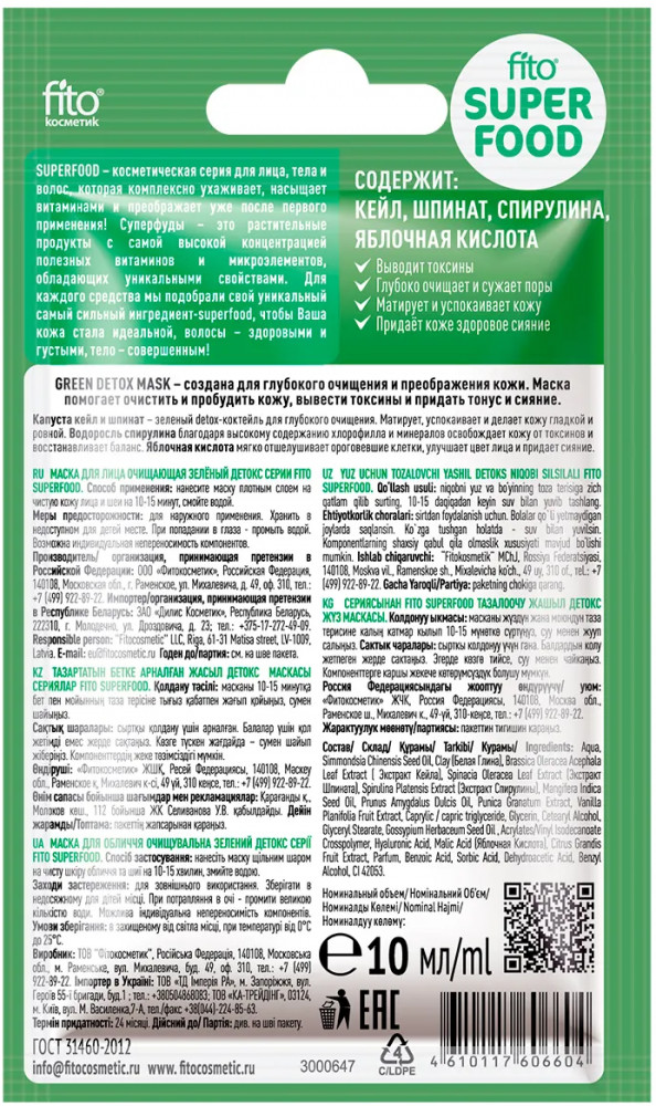 Фитокосметик Маска для лица очищающая «Зеленый детокс»матирует холодит классно пахнет В данный момент этот товар отсутствует в продаже. Возможно, у нас найдется аналогичный или похожий товар здесь. Green detox mask – создана для глубокого очищения и преображения кожи. Маска помогает очистить и пробудить кожу, вывести токсины и придать тонус и сияние. Капуста кейл и шпинат – зеленый detox-коктейль для глубокого очищения. Матирует, успокаивает и делает кожу гладкой и ровной. Водоросль спирулина благодаря высокому содержанию хлорофилла и минералов освобождает кожу от токсинов и восстанавливает баланс. Яблочная кислота мягко отшелушивает ороговевшие клетки, улучшает цвет лица |