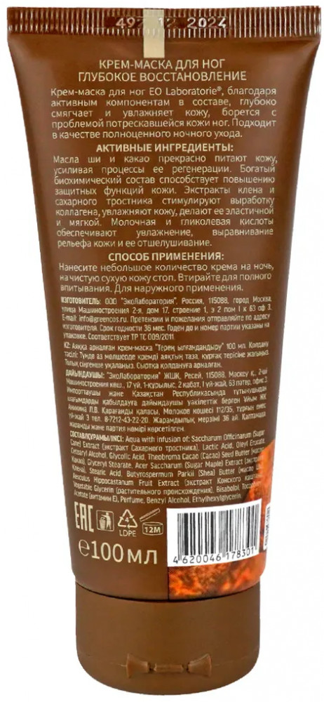 Eco Laboratorie Крем-маска для ног «Глубокое восстановление»В данный момент этот товар отсутствует в продаже. Возможно, у нас найдется аналогичный или похожий товар здесь. Благодаря активным компонентам в составе, крем-маска для ног глубоко смягчает и увлажняет кожу, борется с проблемой потрескавшейся кожи ног. Подходит как полноценный ночной уход за ногами. |