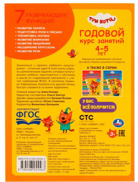 Учебное пособие «Три кота. Годовой курс занятий, 4-5 лет» — отличный развивающий подарок для маленьких поклонников мультсериала про любознательных котят: