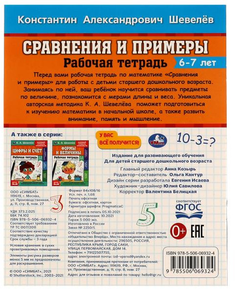 💳 Оплатить за товар можно при получении 🇰🇿 Есть бесплатная доставка по Казахстану от 1 дня 🎁 Копите бонусы с каждой покупки Рабочая тетрадь для детей 6-7 лет «К. А. Шевелёв. Сравнение и примеры» поможет дошкольнику расширить свои знания в области математики: |