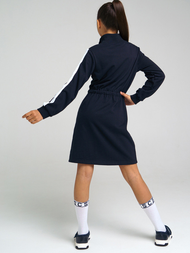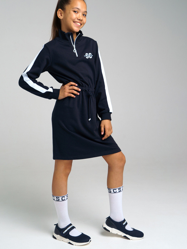 Платье из плотного трикотажа. Тёмно- синего цвета. На холодную погоду точно. Т.к достаточно тёплое. По рукавам идёт белая полоса. Чуть ниже плеча белая нашивка. Сочетается с полосами. Отрезное. По талии затягивается поясом. Присобирается, если его затягивать. Добротное, качественное трикотажное платье. Взяли для школы и не только. Платье очень понравилось. Флип, спасибо
