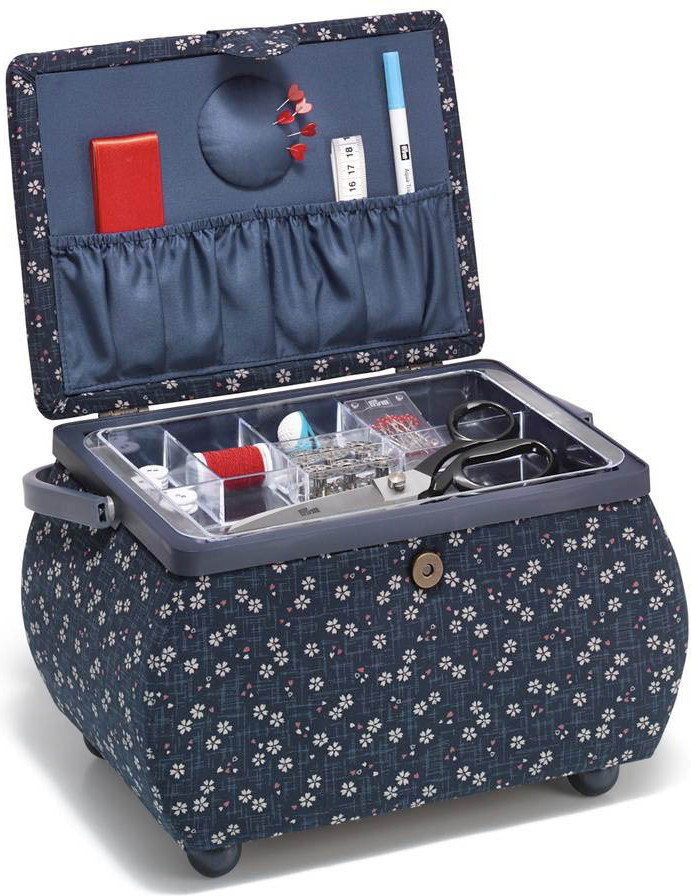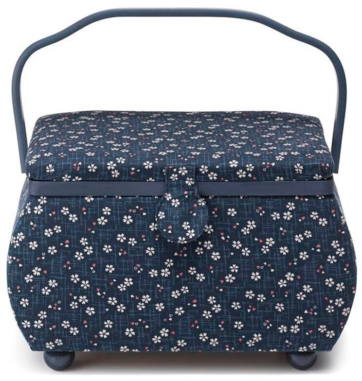 Большая корзина для шитья «Сакура» впечатляет своим романтичным видом: темно-синий хлопковый чехол с рассыпчатыми сладкими кремовыми цветами и маленькими сердечками идеально гармонирует с синей устойчивой ручкой.