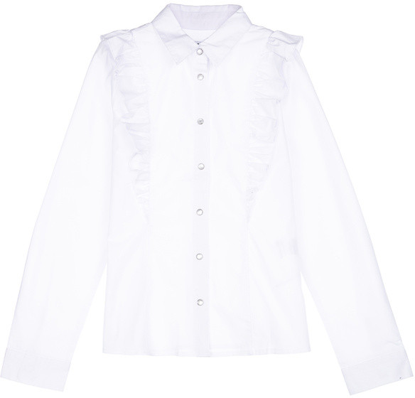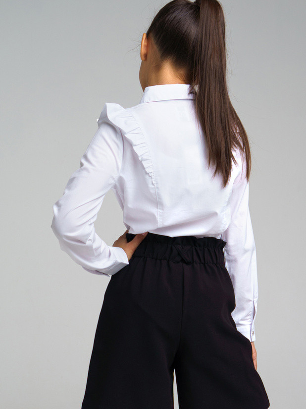 Блузка текстильная с высоким содержанием хлопка. Декорирована рельефами и декоративной рюшей. Застежка на кнопки.