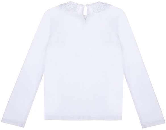 Трикотажная блузка. Высокое содержание хлопка 95%, а благодаря наличию эластана в составе ткани, изделие проще в уходе и держит форму. Полуприлегающий силуэт. Кружевной воротник декорирован бантом. Застежка на спине на пуговицу.