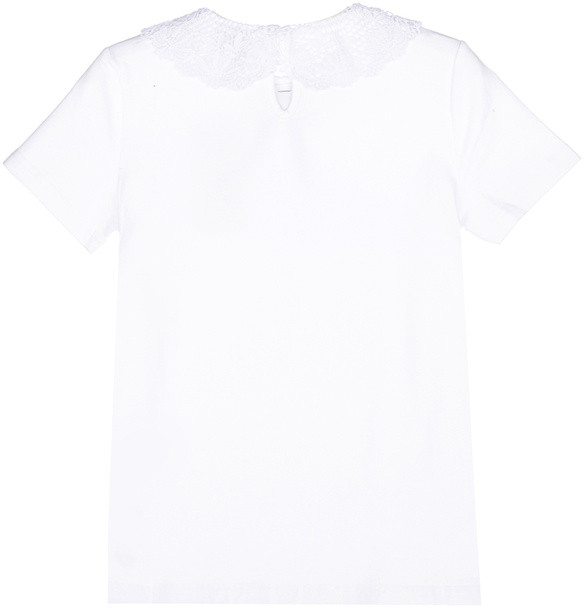 Блузка трикотажная из качественного и приятного на ощупь трикотажа. Высокое содержание хлопка 95%. Благодаря наличию эластана в составе ткани изделие проще в уходе и держит форму. Полуприлегающий силуэт. Кружевной воротник декорирован бантом. Застежка на спине на пуговицу.