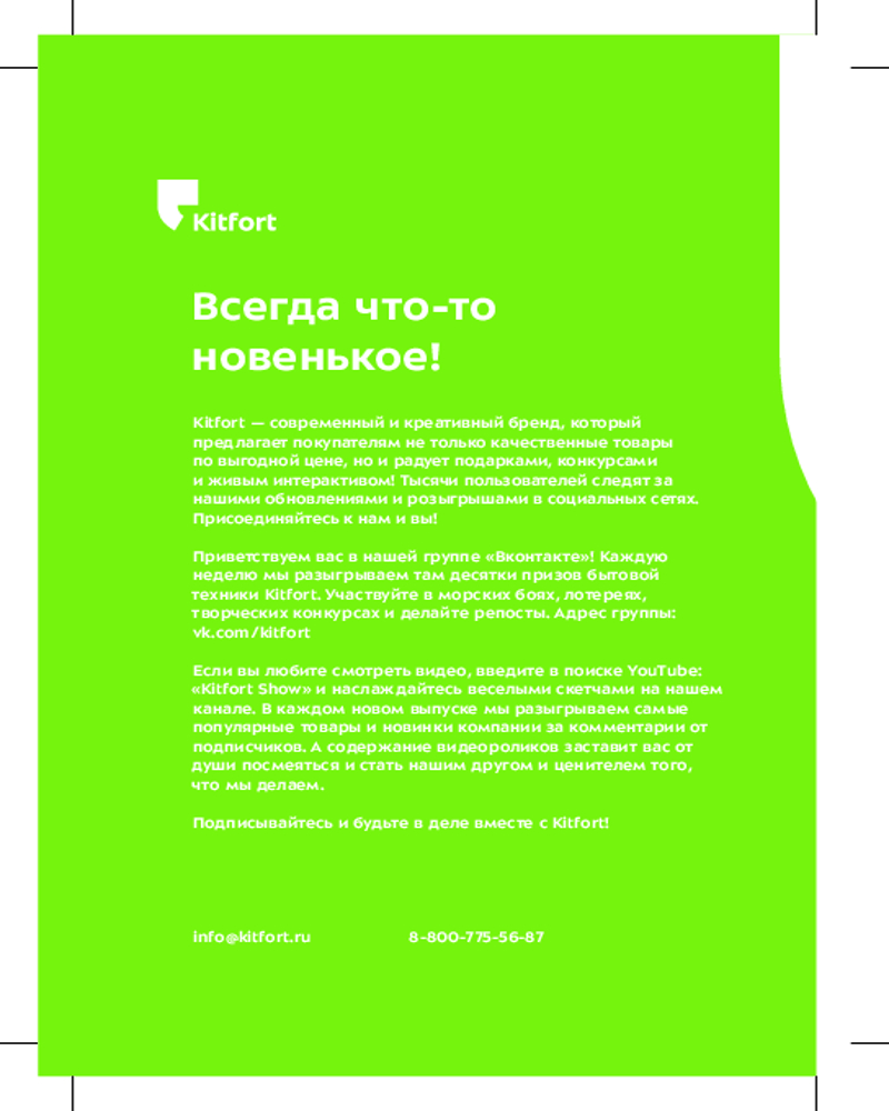 Российский бренд Kitfort занимает лидирующие позиции на рынке бытовой техники для кухни и дома. Основанная в 2011 году в городе Санкт-Петербурге, компания Kitfort стремится предоставить своим клиентам передовые технологии и инновационные решения для повседневных задач и создания комфортного пространства в доме.