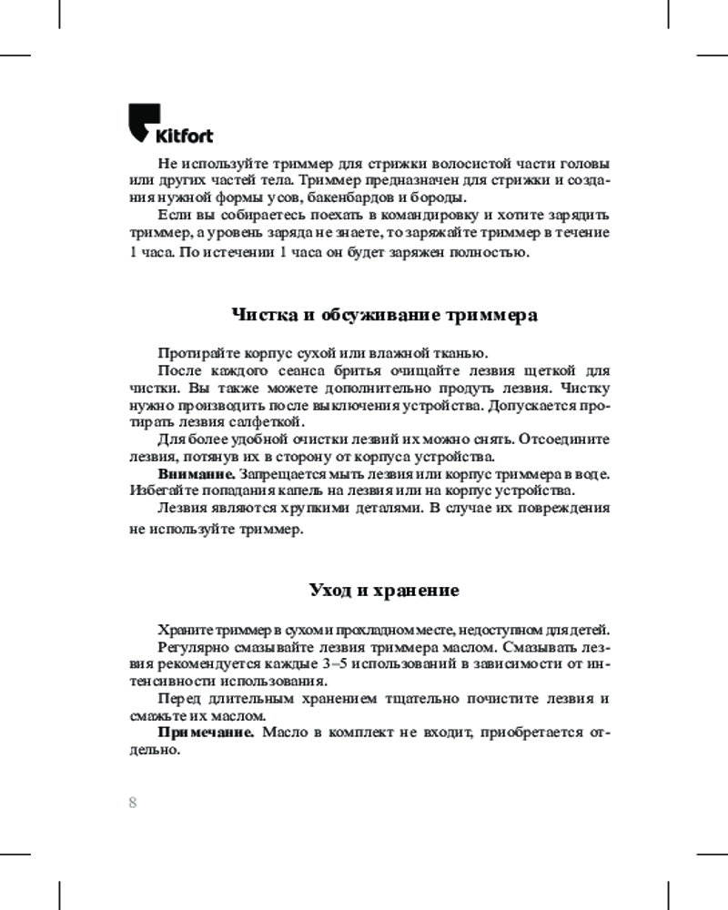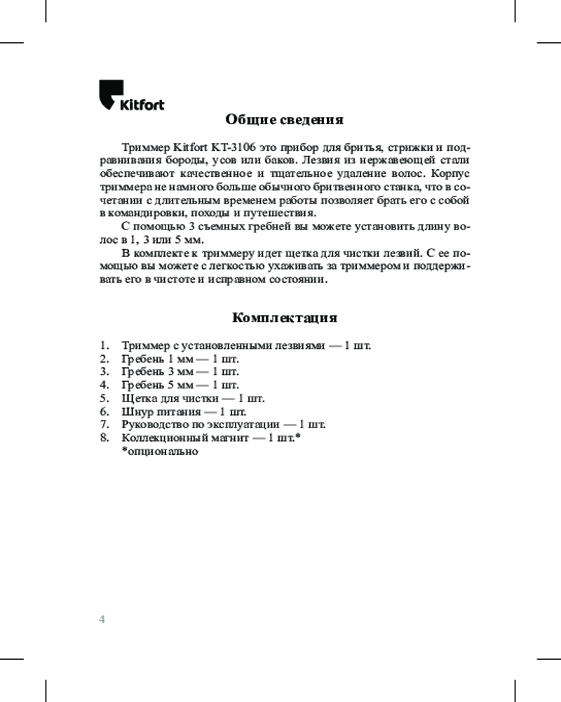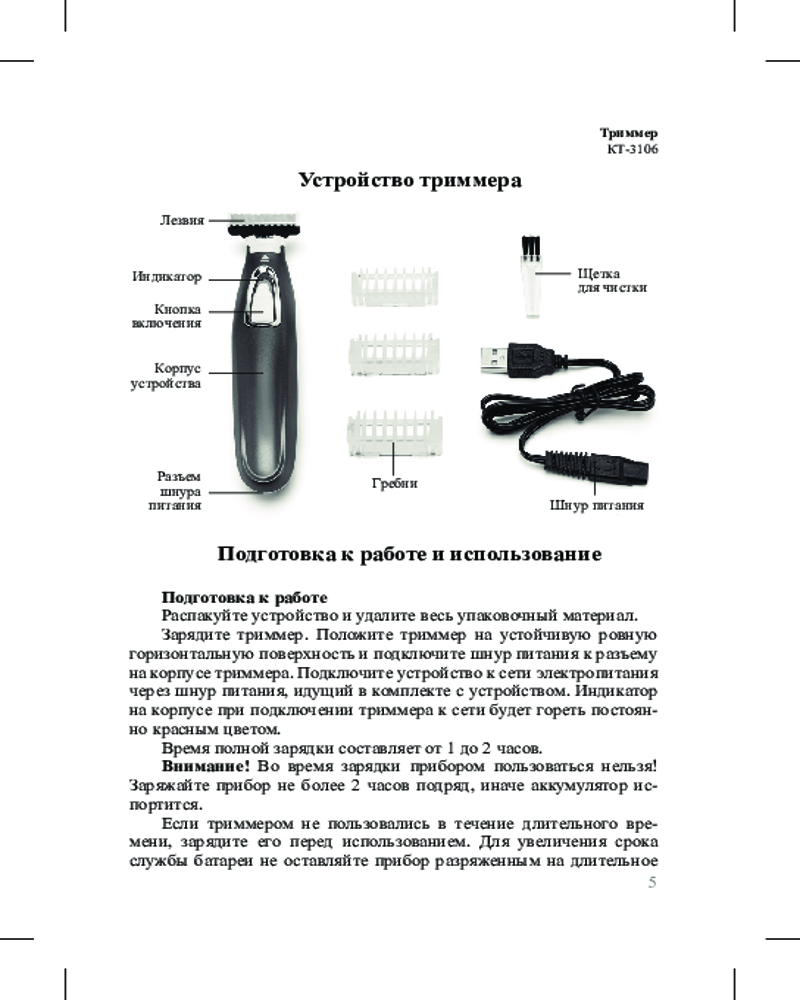 Триммер KT-3106 — прибор для бритья, стрижки и подравнивания бороды, усов или баков. Корпус триммера не больше обычного бритвенного станка, что в сочетании с длительным временем работы (60 мин) позволяет брать его с собой в командировки и путешествия.