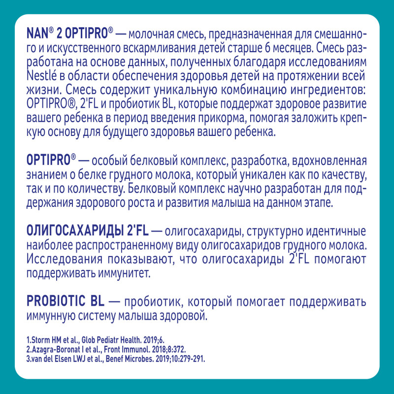 Nestle Смесь молочная «NAN Optipro №2»В данный момент этот товар отсутствует в продаже. Возможно, у нас найдется аналогичный или похожий товар здесь. NAN Optipro № 2 — молочная смесь, предназначенная для кормления детей с 6 месяцев до 12 месяцев. Смесь разработана на основе данных, полученных благодаря исследованиям питания Nestle в области обеспечения здоровья детей на протяжении всей жизни. |