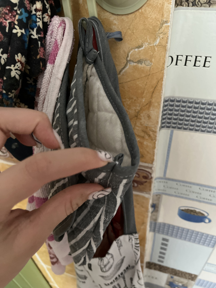прихватки хорошие, нормальной толщины. фартук на фото смотрится более плотным . размер на стройную женщину, среднему мужчине маловат.