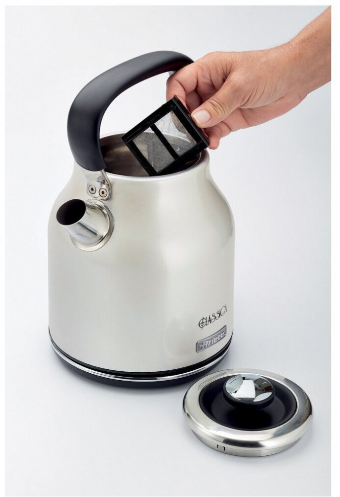 Электрический чайник с уникальным дизайном, является частью новой серии Ariete Classica. Первая скрипка на вашей кухне! Утончённое оформление этого чайника от итальянского бренда с мировым именем было создано под впечатлением от прослушивания неповторимой классической музыки. Отсутствие углов, плавность линий корпуса, стильные хромированные детали создают особую атмосферу для приятных чаепитий, наслаждения ароматными травяными настоями или бодрящим утренним кофе. Классика никогда не стареет, она способна пробуждать в человеке лучшие качества и умение видеть красоту. Классический дизайн нового чайника от Ariete отлично впишется в любой интерьер, преобразит вашу кухню и соберёт за общим столом родных и близких людей.