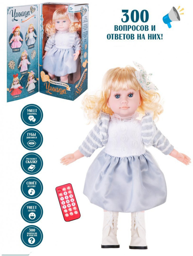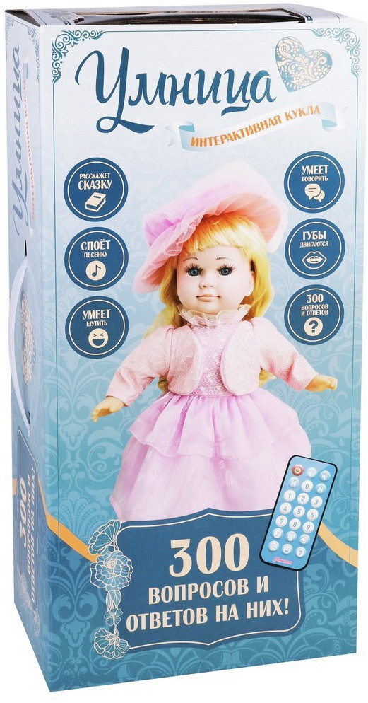 А еще кукла способна рассказать несколько увлекательных историй и помочь выучить английский язык! А вообще кукла любит пошутить — это непременно рассмешит девочку! Громкость регулируется. Во время диалога губки куколки шевелятся. На куколке прелестный наряд. Кукла знает обо всем на свете! Переключать режимы или задать номер вопроса (1-300) можно с помощью кнопок пульта.