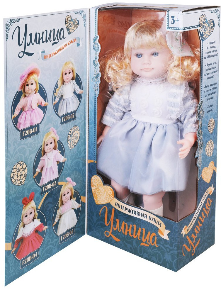Какая кукла может стать лучшей подружкой девочки? Интерактивная кукла «Умница»! Если кукле задавать определенные вопросы, то она будет на них отвечать. На каждый вопрос у нее несколько вариантов ответов! Если попросить ее спеть песню, то она споет одну из милых детских песенок.