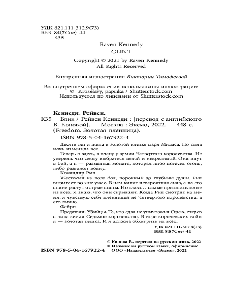 💳 Оплатить за товар можно при получении 🇰🇿 Есть бесплатная доставка по Казахстану от 1 дня 🎁 Копите бонусы с каждой покупки Серия: Freedom. Золотая пленница Десять лет я жила в золотой клетке царя Мидаса. Но одна ночь изменила все. Теперь я здесь, в плену у армии Четвертого королевства. Не уверена, что смогу выбраться целой и невредимой. Они идут в бой, а я — разменная монета, которая либо погасит огонь, либо развяжет войну. Командир Рип. |