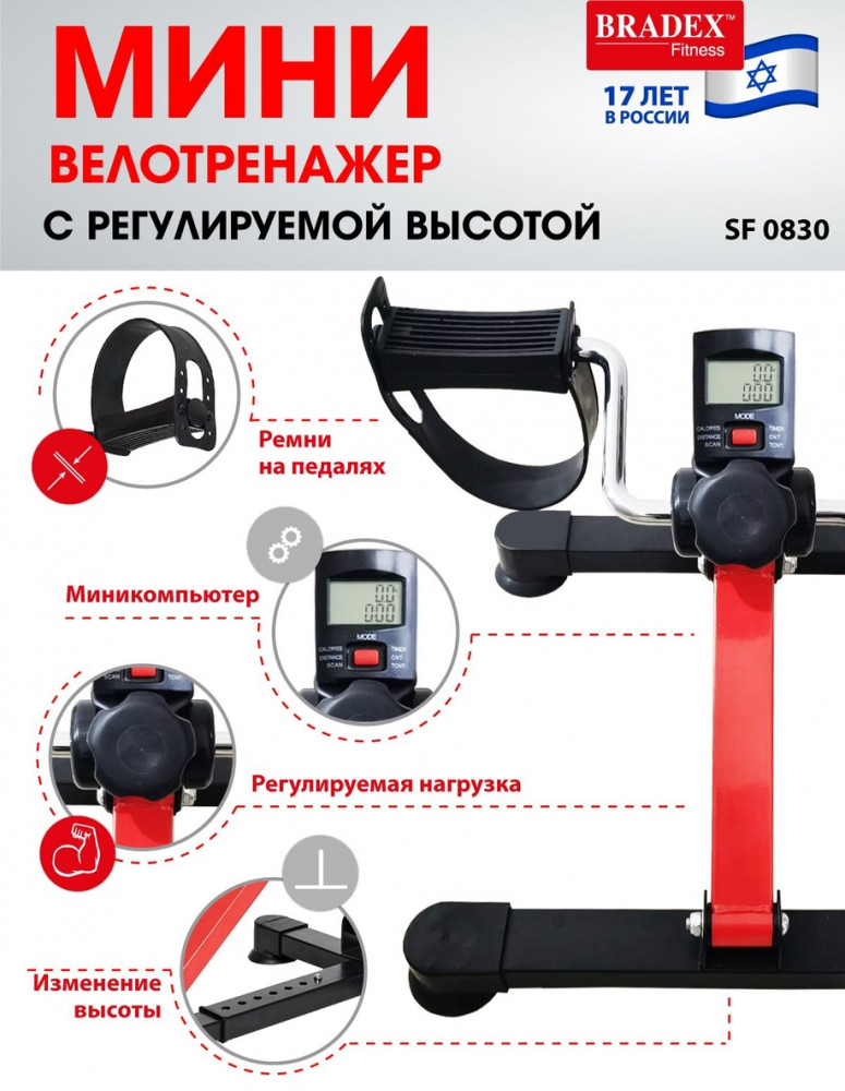 Для того, чтобы заниматься на минивелотренажере вы можете удобно расположиться на стуле или кресле. Для комфортной тренировки у тренажера имеются регулировка положения по высоте. «Bradex SF 0830» позволяет устанавливать и регулировать уровень сложности в зависимости от уровня вашей подготовки. Цифровой дисплей устройства показывает, сколько времени и калорий вы потратили и какое количество оборотов совершили. Педали тренажера сделаны из материала, который обеспечивает хорошее сцепление и дополнительно оснащены ремнями-креплениями — это предотвратит соскальзывание стопы.