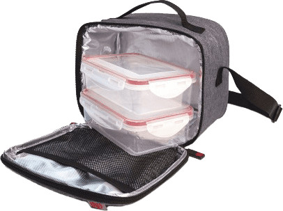 Отлично сохраняет свежесть и вкус продуктов в течение нескольких часов. Пригодится везде: на прогулке, на работе, учёбе и т.д. Очень простой и удобный в использовании. Внутри есть удобный кармашек для столовых приборов и салфеток, снаружи предусмотрен дополнительный закрывающийся карман. Ланч бокс — имеет регулируемый ремень для переноски (в одной руке или на плече). В комплект входят герметичные контейнеры из высококачественного экологичного пищевого пластика с уплотнителем из силикона и специальный разделительный барьер из теплоотражающего материала. Контейнеры можно использовать в микроволновой печи (обязательно без крышки), а также помещать в морозильную камеру. Барьер позволяет удобно зонировать внутреннее пространство ланч бокса для различных продуктов и закусок.