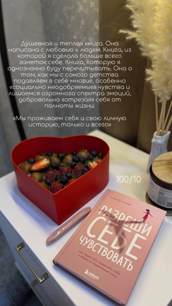 Книга «Разреши себе чувствовать» Юлии Булгаковой — это глубокое и полезное руководство для тех, кто хочет научиться принимать и выражать свои эмоции. Автор предлагает практические инструменты и техники для развития эмоционального интеллекта, преодоления страхов и ограничений, а также для улучшения отношений с окружающими. Книга написана доступным языком и содержит множество примеров из жизни, что делает её лёгкой для восприятия. Читатели отмечают, что после прочтения книги они стали лучше понимать свои эмоции, научились их контролировать и использовать в своих интересах.