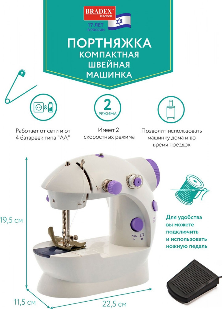 Bradex Машина швейная «Портняжка»В данный момент этот товар отсутствует в продаже. Возможно, у нас найдется аналогичный или похожий товар здесь. Компактная швейная машинка «Портняжка» — полезное приспособление в быту. С ее помощью Вы можете не только дома, но даже в путешествии или в походных условиях подшить одежду, поставить заплатку и так далее. Даже в домашних условиях для мелких швейных работ Вам будет намного удобнее пользоваться этим мини-прибором вместо громоздких швейных машин. |