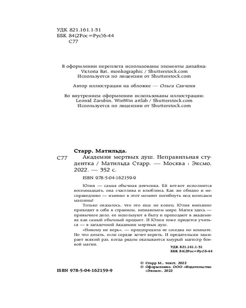 Академия мертвых душ. Неправильная студенткаВ данный момент этот товар отсутствует в продаже. Возможно, у нас найдется аналогичный или похожий товар здесь. Серия: Академия мертвых душ Если тебя на полном ходу сбивает огромная фура — обычно на этом все и заканчивается. Но для меня все только началось. |
