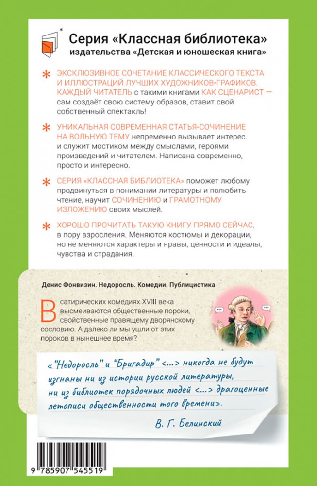 💳 Оплатить за товар можно при получении 🇰🇿 Есть бесплатная доставка по Казахстану 🎁 Копите бонусы с каждой покупки Серия: Классная библиотека Денис Иванович Фонвизин (1745-1792) считается создателем русской бытовой комедии. Можно сказать, что «Недоросль» и «Бригадир» открывают «золотой век» русской литературы. Автор высмеивает общественные пороки, свойственные дворянскому сословию, противопоставляя им верные и вечные нравственные ориентиры: честность, труд, ум, патриотизм. Комедии отличаются яркими образами и тонким юмором, а многие цитаты стали крылатыми выражениями. |