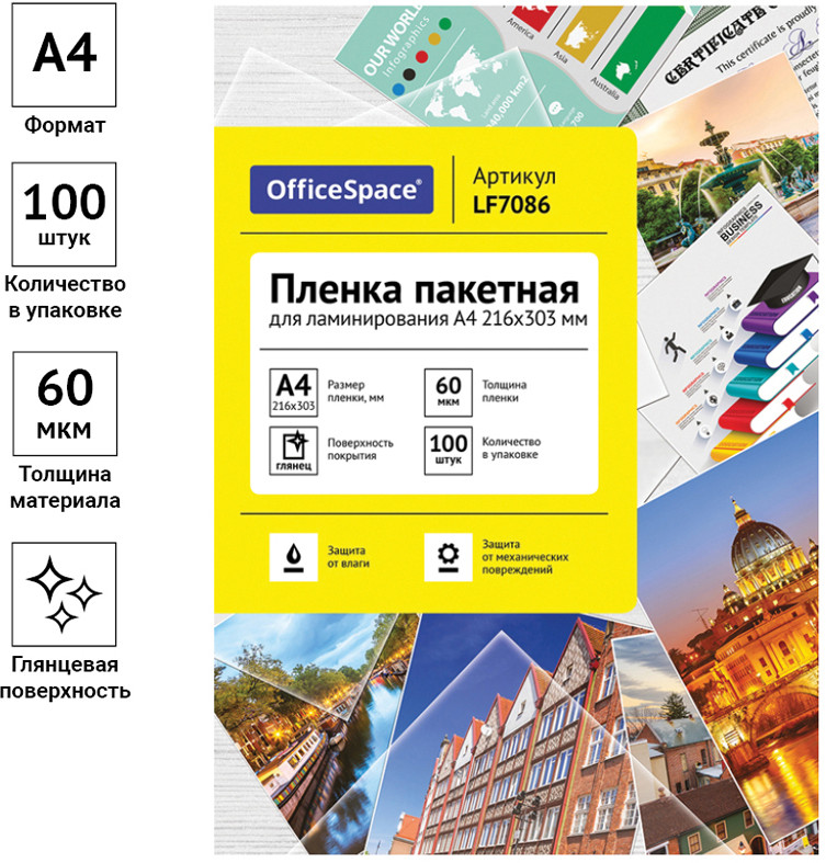 OfficeSpace Пленка для ламинированияВ данный момент этот товар отсутствует в продаже. Возможно, у нас найдется аналогичный или похожий товар здесь. Глянцевая пакетная пленка «OfficeSpace» прекрасно подходит для ламинирования документов. Предназначена для использования в ламинаторах «горячего» типа. Придает документу жесткость, обладает высокой прозрачностью после ламинации, защищает документ от механических повреждений и воздействия влаги. |