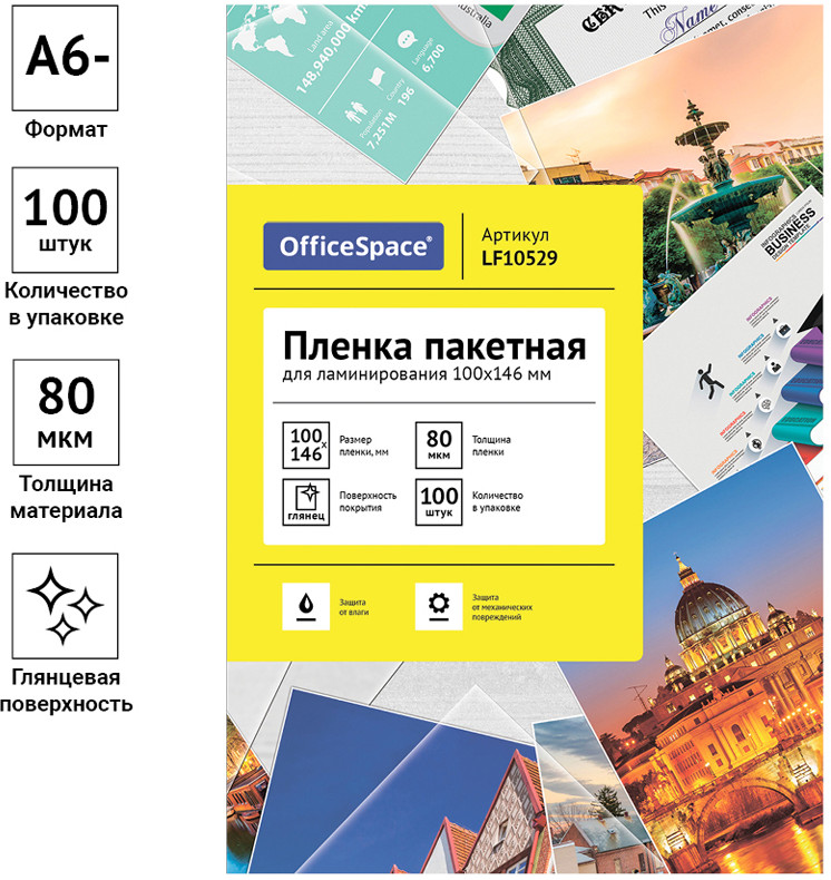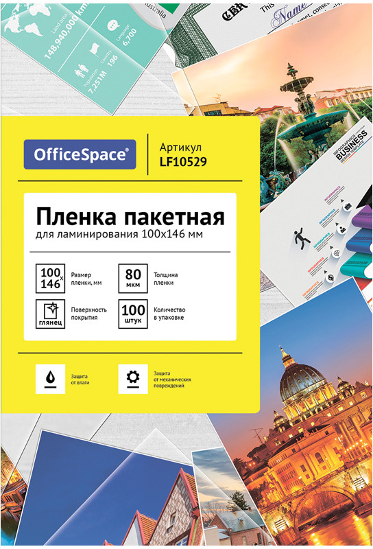 OfficeSpace Пленка для ламинированияВ данный момент этот товар отсутствует в продаже. Возможно, у нас найдется аналогичный или похожий товар здесь. Глянцевая пакетная пленка «OfficeSpace» прекрасно подходит для ламинирования документов. Предназначена для использования в ламинаторах «горячего» типа. Придает документу жесткость, обладает высокой прозрачностью после ламинации, защищает документ от механических повреждений и воздействия влаги. |
