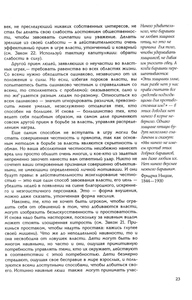 48 законов властиВ данный момент этот товар отсутствует в продаже. Возможно, у нас найдется аналогичный или похожий товар здесь. Это самая аморальная, самая скандальная, самая циничная… и самая правдивая книга о власти, начиная с незамысловатой, бытовой и кончая президентской. Отныне, познав блестяще сформулированные и подкрепленные интереснейшими и неожиданными историческими фактами жесткие и жестокие законы поведения во власти, вы без труда распознаете то, что стоит за теми или иными словами и поступками "маленьких" начальников и сильных мира сего, то, что тщательно они пытаются скрыть. |