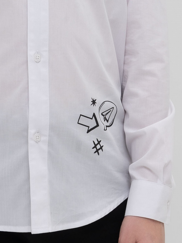 На рост ребенка 160 размер 164 сел с запасом в рукавах, длина ниже попы, рубашку не заправляют из-за рисунка снизу.Под пиджак нормально одевать, не висит снизу.