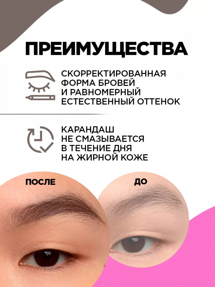 Карандаш очень хорошо подошел по цвету, нанесение на брови очень легко сделать. Неожиданно для меня оказался очень тонким, но мне это не мешает. Рекомендую.