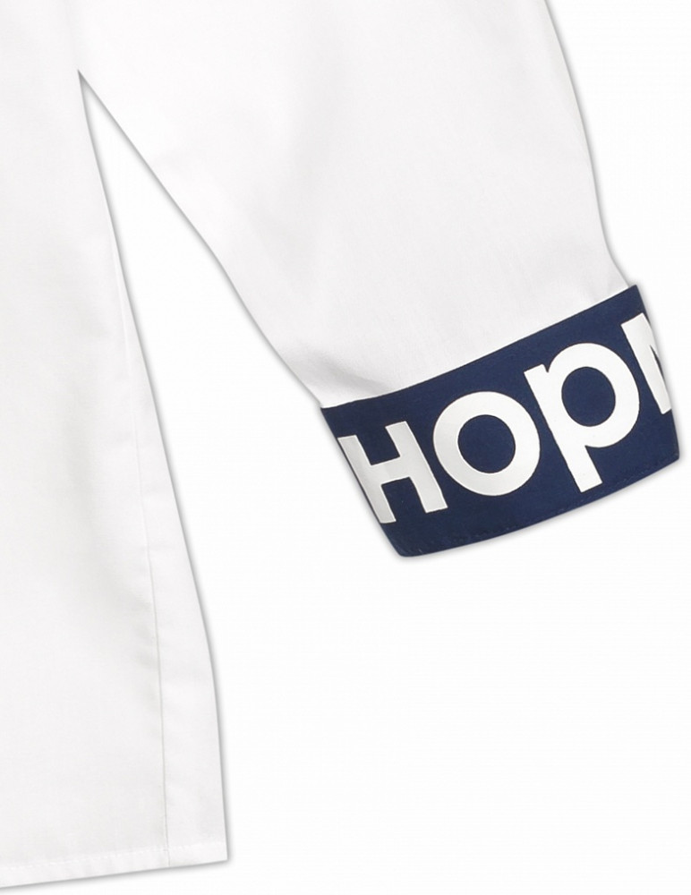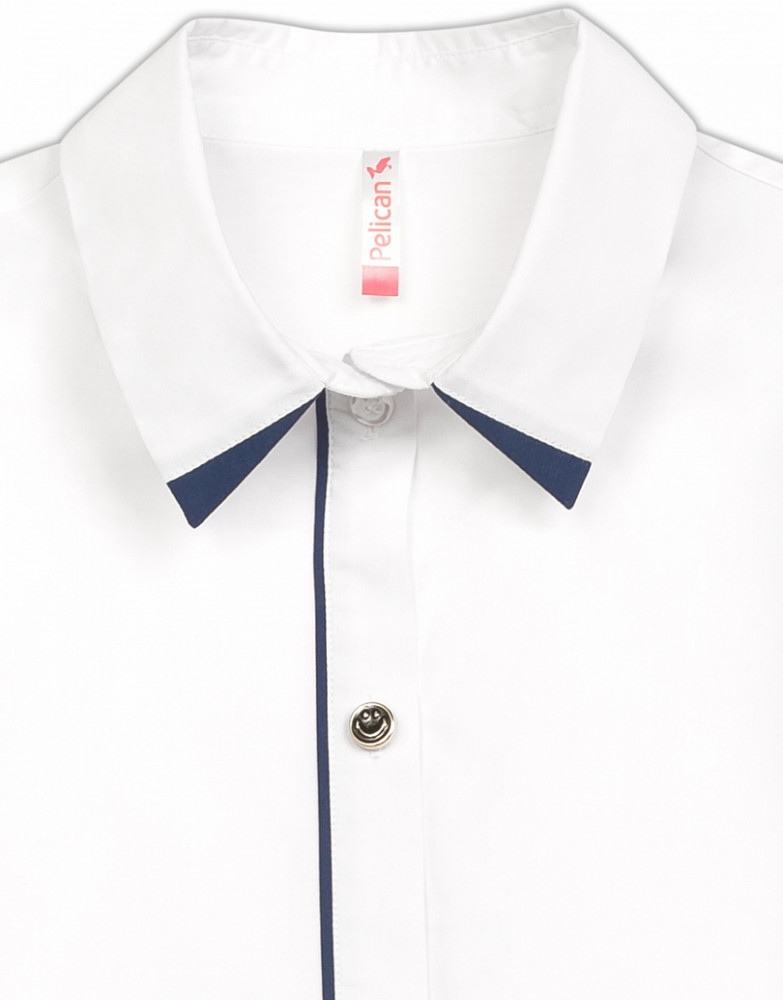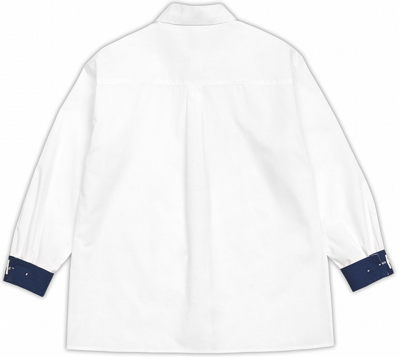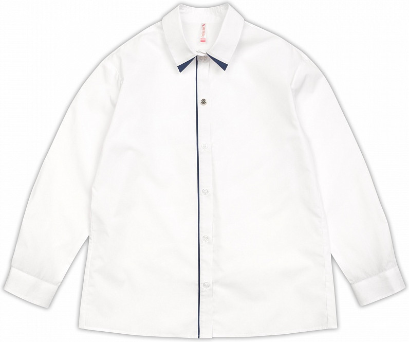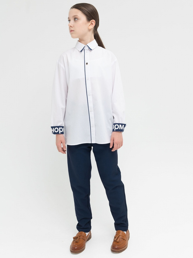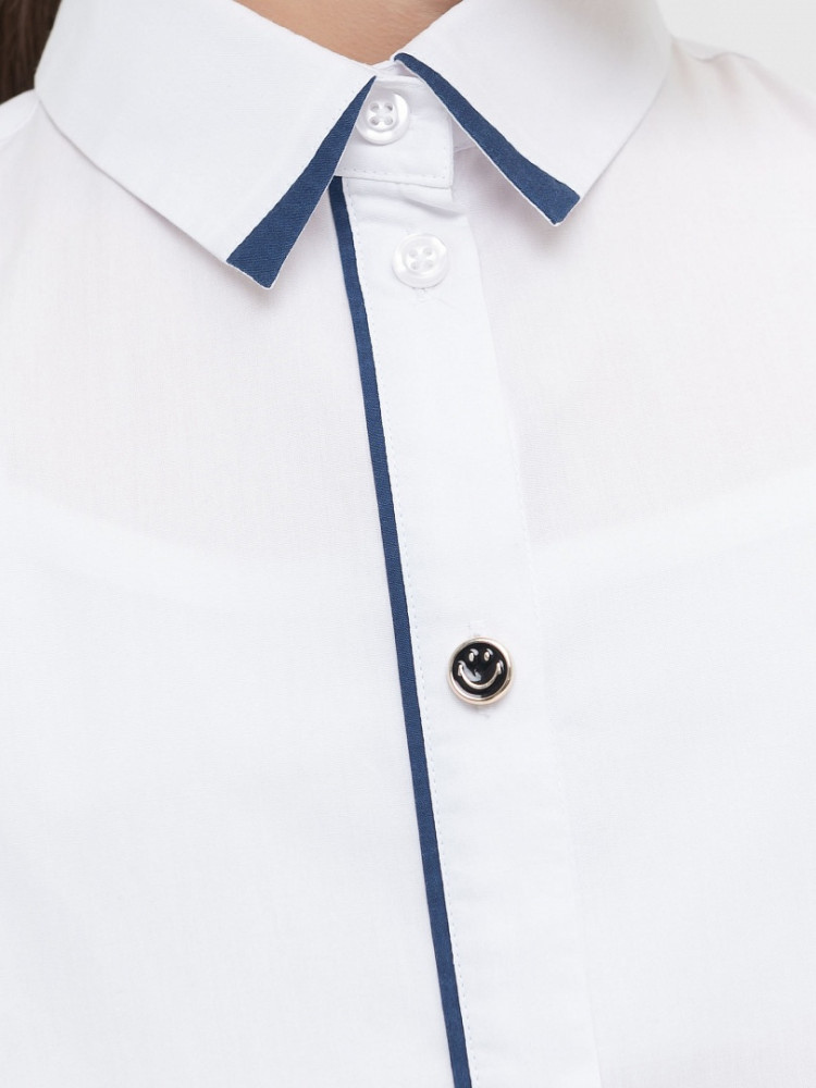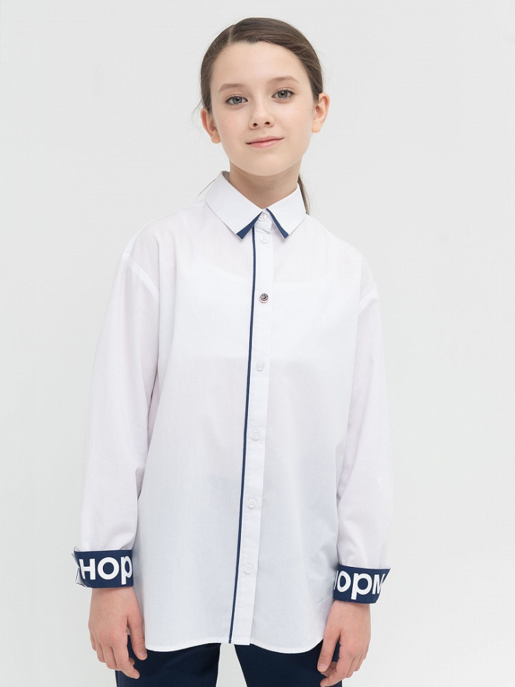 Рубашка для девочки из практичной ткани с современными деталями. Планка, концы воротника и внутренние манжеты выполнены из ткани контрастного цвета. Это разбавляет официальный стиль и позволяет не стирать белую рубашку каждый день.
