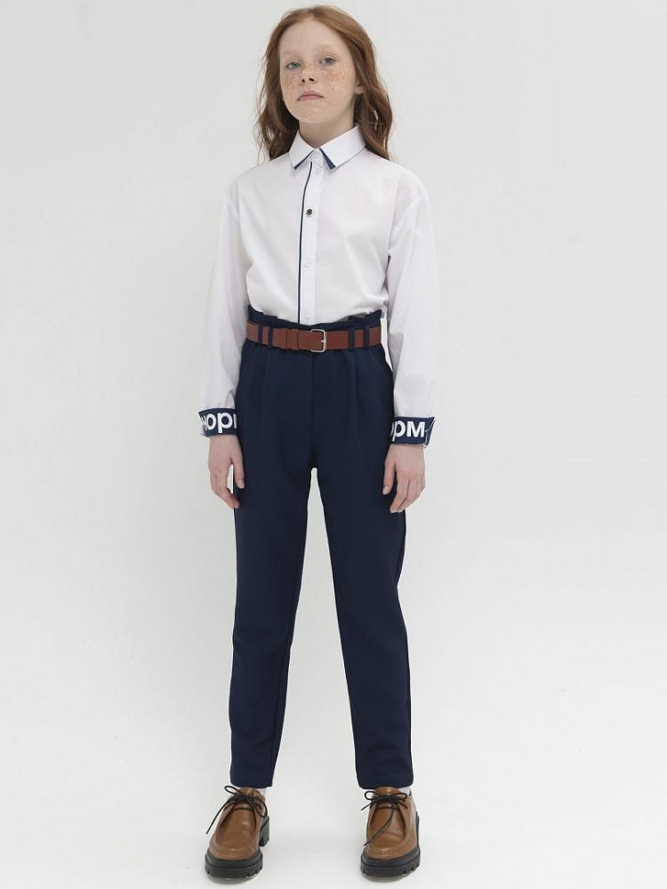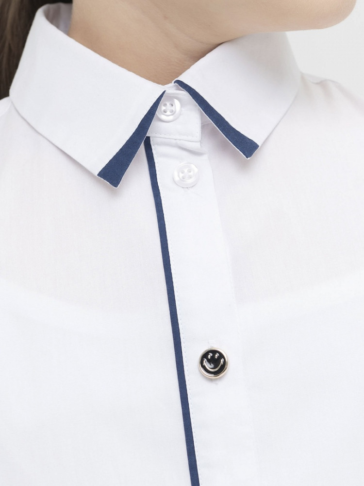 Рубашка для девочки из практичной ткани с современными деталями. Планка, концы воротника и внутренние манжеты выполнены из ткани контрастного цвета. Это разбавляет официальный стиль и позволяет не стирать белую рубашку каждый день.
