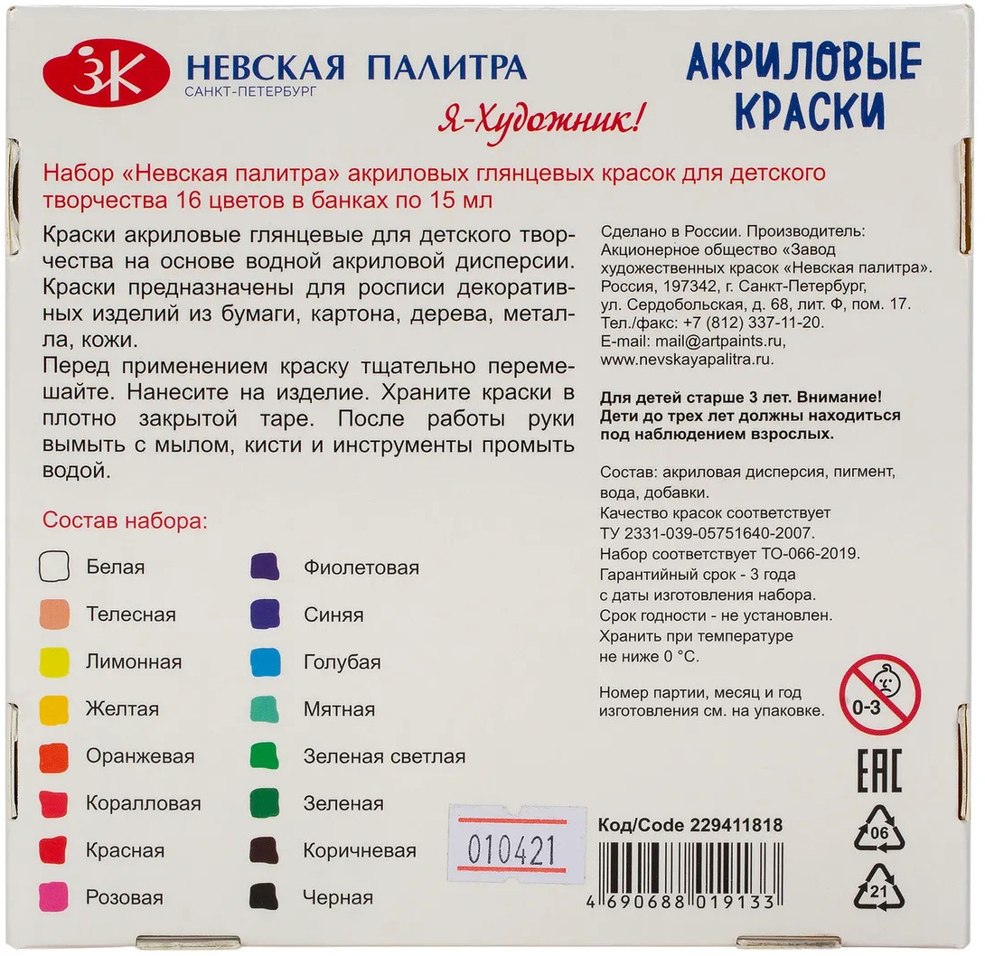 Я — художник! Краски акриловые глянцевыеВ данный момент этот товар отсутствует в продаже. Возможно, у нас найдется аналогичный или похожий товар здесь. Акриловые глянцевые краски для детского творчества на основе водной акриловой дисперсии. Предназначены для росписи декоративных изделий из бумаги, картона, дерева, металла, кожи. Краски хорошо смешиваются, быстро высыхают. После высыхания приобретают глянцевый блеск, не смываются водой. |