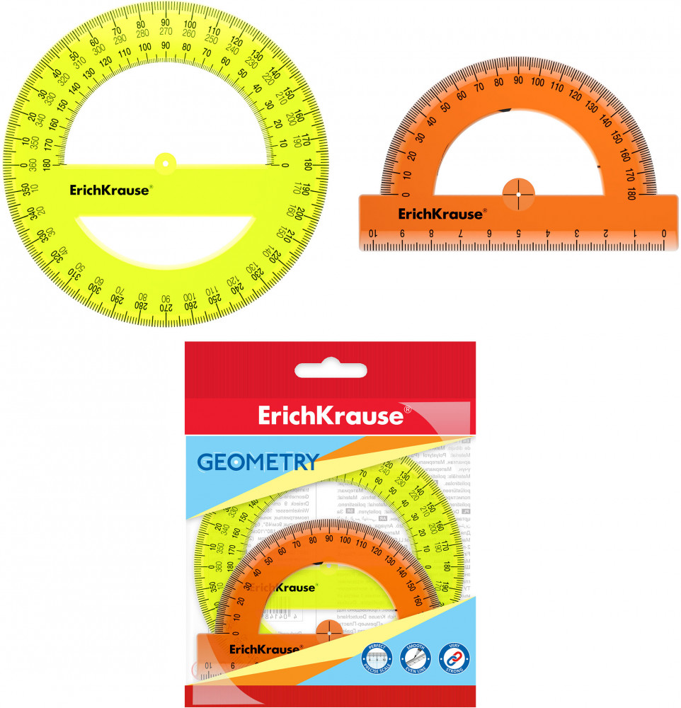 В наборе: транспортиры: 180°/10 см – оранжевый, 360°/12 см – желтый.