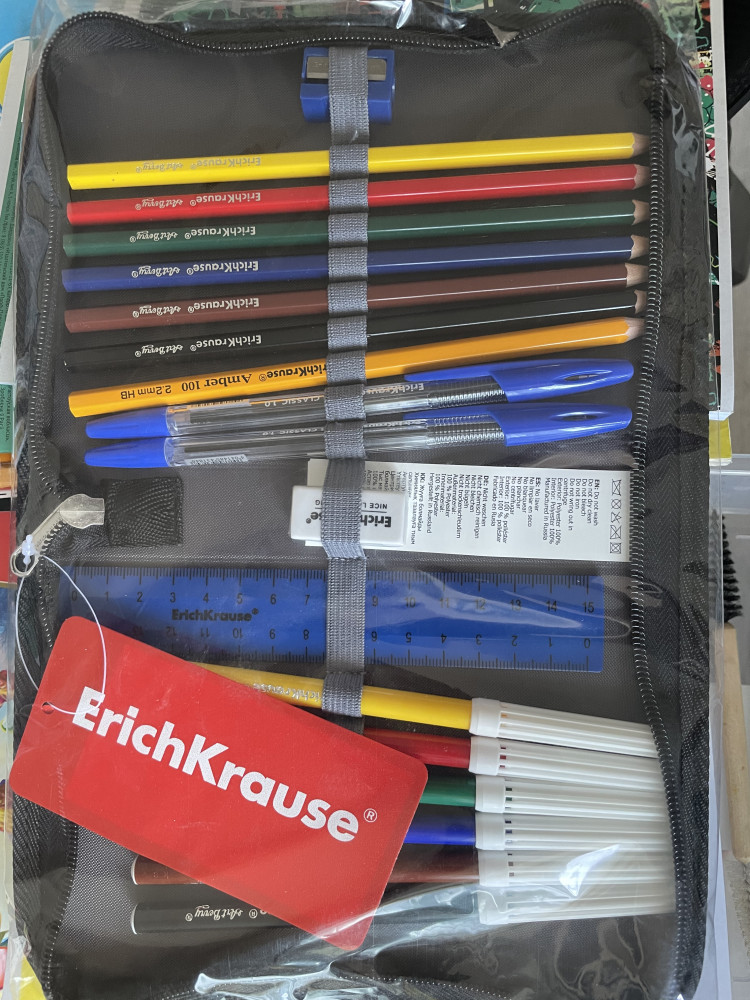 Доставка вовремя. В наборе 6 цветных карандашей, 6 цветных фломастеров, точилка, ластик, линейка, 1 простой карандаш и 2 ручки.