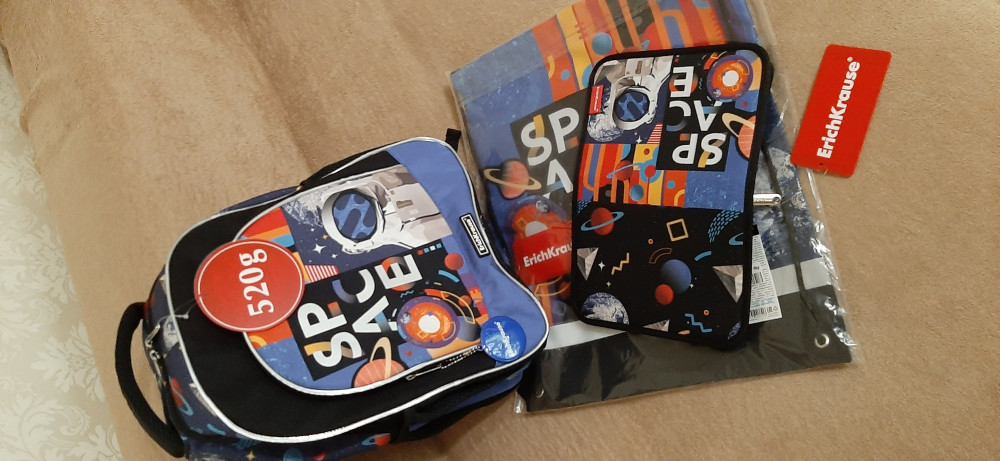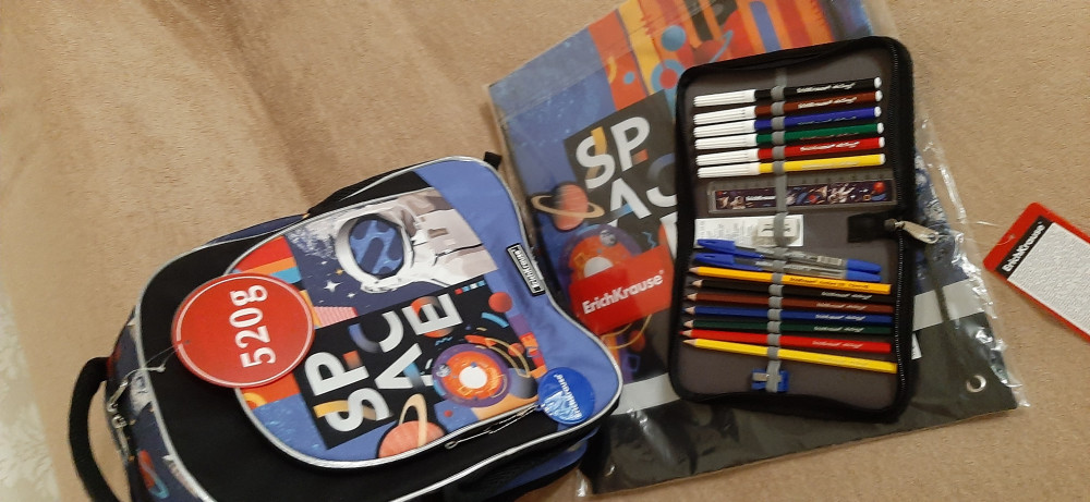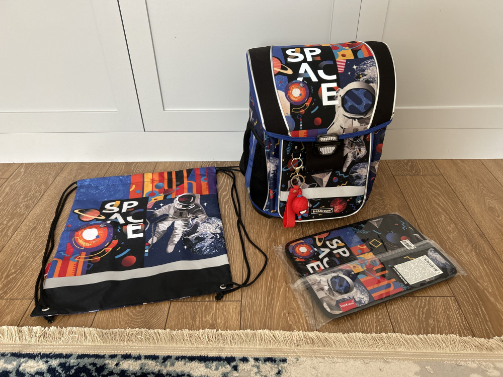 Три плюса: 1) Сразу с наполнением (канцтовары внутри все есть) 2) То, что всё у нас из одной коллекции (рюкзак, сумка для обуви и пенал) 3) ещё понравилось, что даже линейка в нужной тематике, видела в отзывах, что у кого-то была простая синяя линейка.