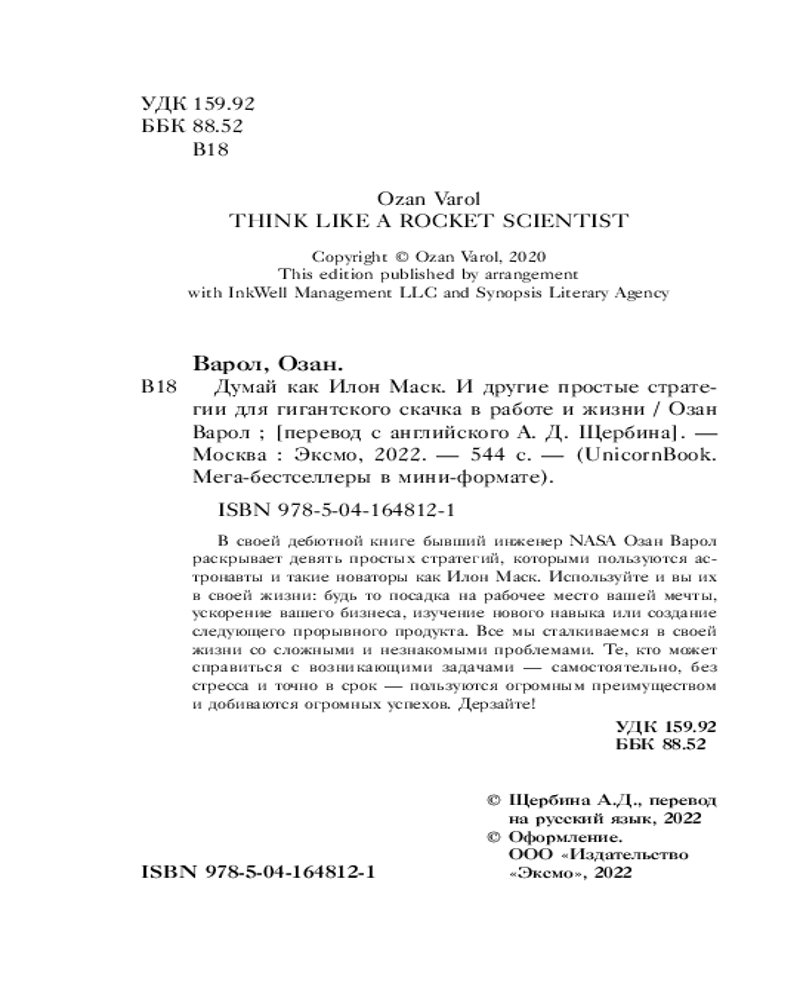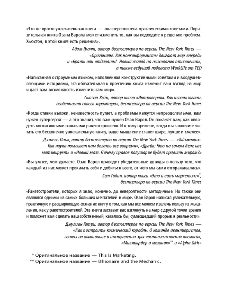 💳 Оплатить за товар можно при получении 🇰🇿 Есть бесплатная доставка по Казахстану от 1 дня 🎁 Копите бонусы с каждой покупки Серия: UnicornBook. Мега-бестселлеры в мини-формате Необязательно быть ракетостроителем, чтобы думать, как один из них! На страницах этой книги вы узнаете, чем мышление инженеров NASA отличается от мышления остальных людей и как вы можете применить его в своей жизни. Отказавшись от страха ошибок, приверженности одной точке зрения и стремлению к определенности во всем, вы сможете иначе взглянуть на свой подход к жизни и конструировать не ракеты, а собственное будущее. |