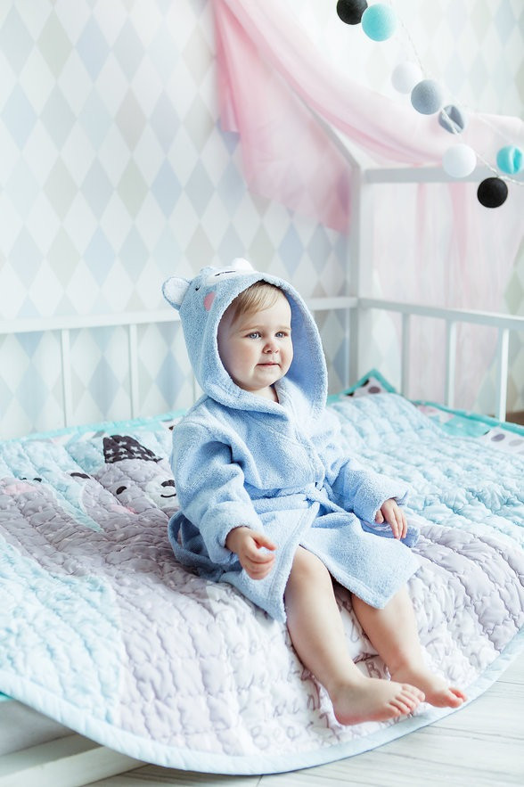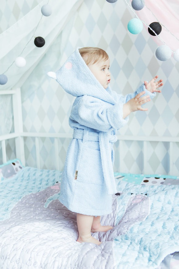 У этого халата безумно красивый цвет и очень милый дизайн с вышитой медвежьей мордочкой. Малыш такой забавный в этом халате. Отмечу также, что материал 100% хлопок, мягкий и приятный на ощупь, хорошо впитывает влагу.