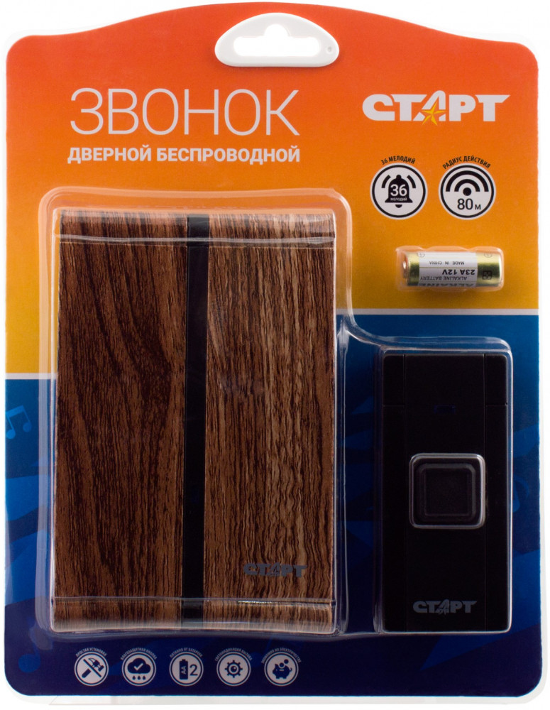 В приборе запрограммировано 36 мелодий для оптимально выбора вызова в соответствии с музыкальными предпочтениями. Кнопка вызова комплектуется батарейкой типоразмера А23. Питание звонка осуществляется посредством трех батареек типоразмера АА. |
