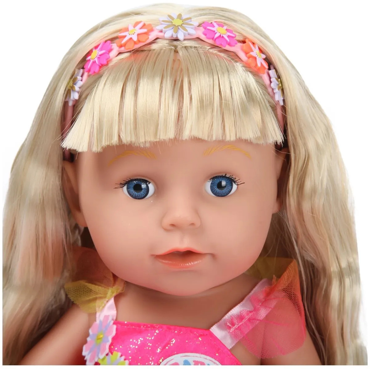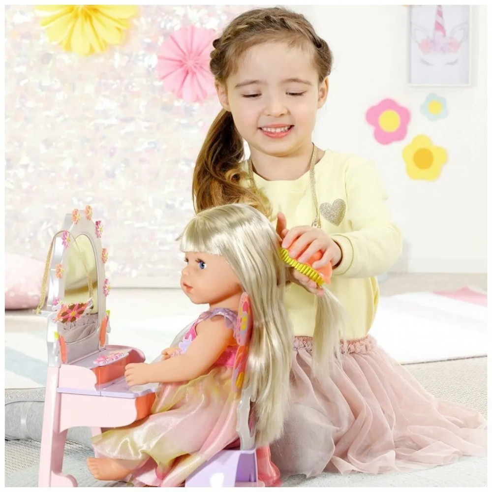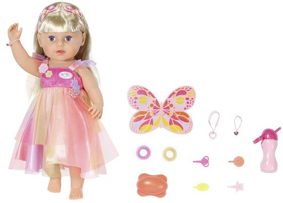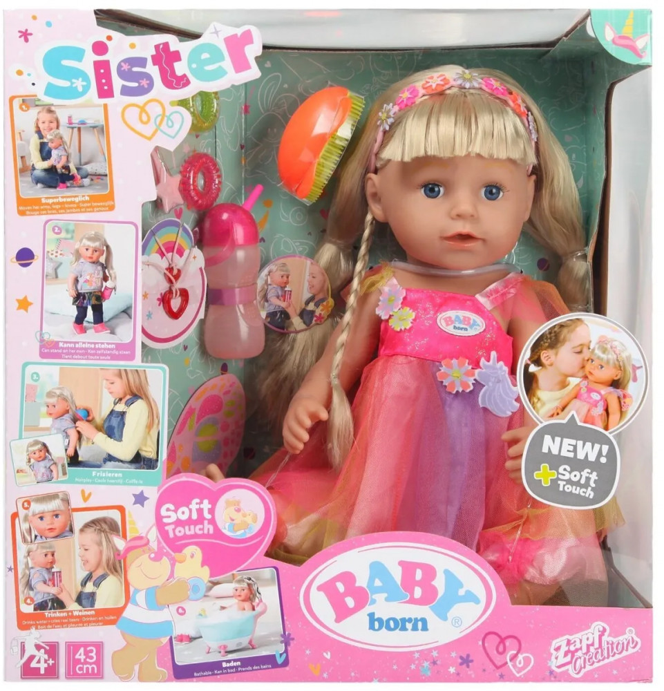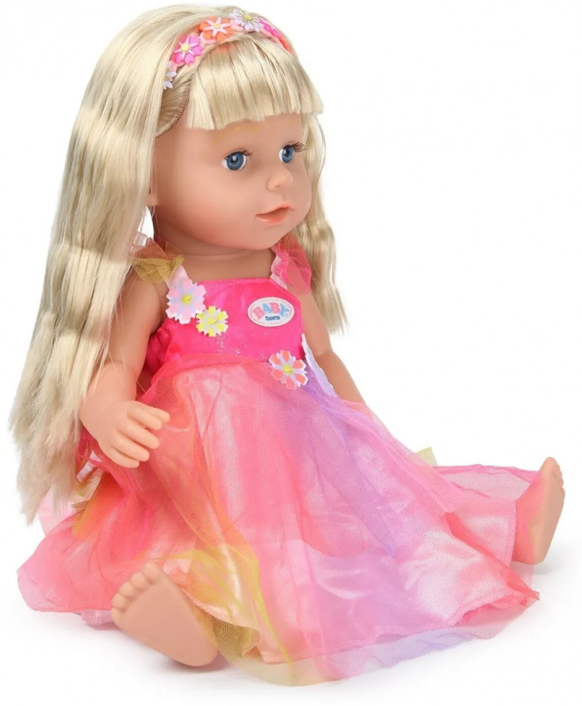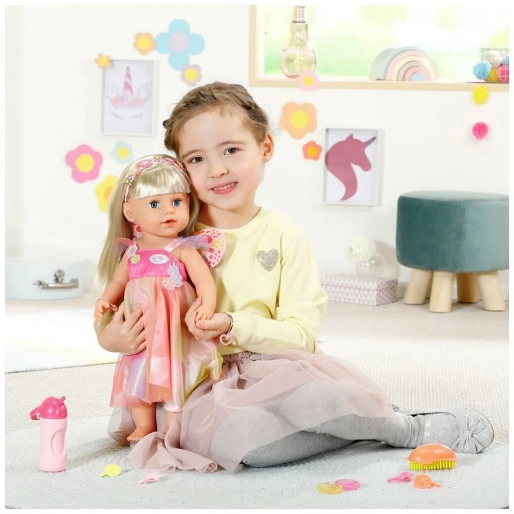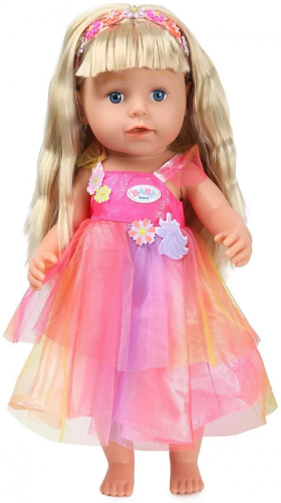 Интерактивная куколка Бэби Борн с красивыми глазками, пухлыми щечками и губками. Длинные светлые волосы с челкой, которые можно расчесывать и делать с ними разные прически. В наборе есть 2 цветные пряди, которые можно использовать при создании креативной прически. Куколка одета в платье единорога с крылышками, а на голове у нее ободок. Высота куколки 43 см. Куколка умеет стоять, у нее подвижные руки и ноги, сгибающиеся колени. Умеет плакать настоящими слезами.