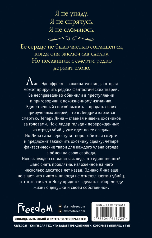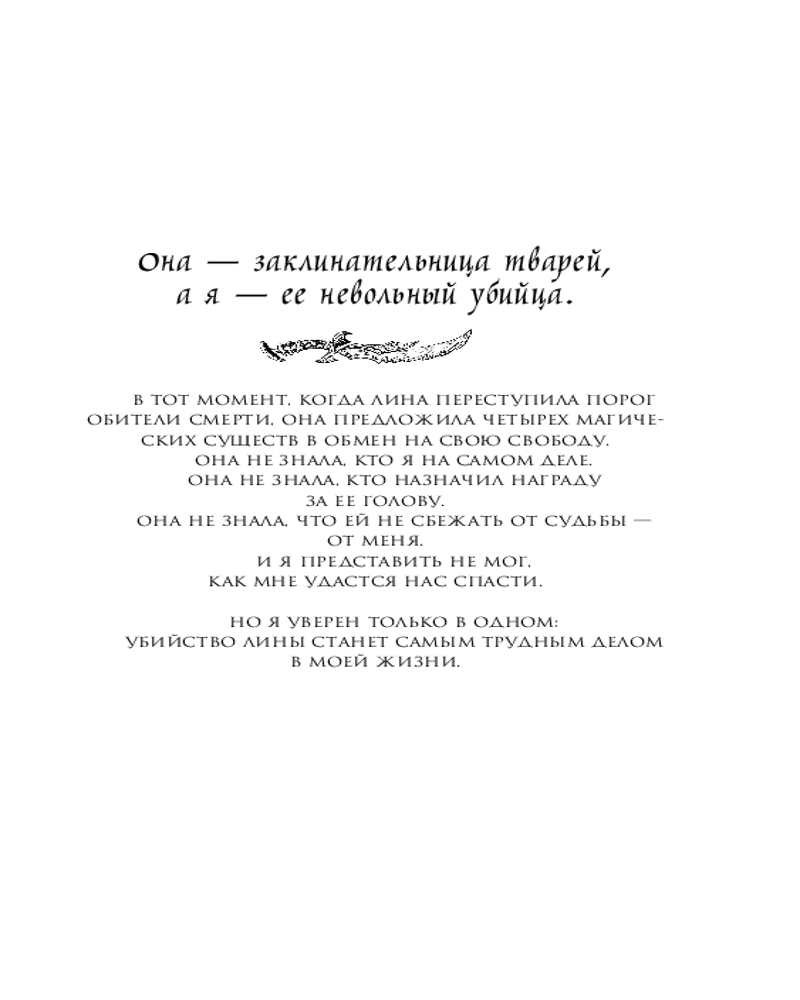 Но Лина сама переступит порог обители смерти и предложит заключить охотнику сделку: четыре фантастических твари для каждого члена отряда в обмен на свою свободу.