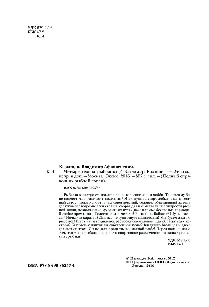 Четыре сезона рыболоваВ данный момент этот товар отсутствует в продаже. Возможно, у нас найдется аналогичный или похожий товар здесь. Серия: Полный справочник рыбной ловли Без знания техники и тактики ужения, а также, а также без постоянной практики шансы рыболова на успех в современных условиях невелики. Все чаще целью рыбалки становится не азарт добытчика, а способность перехитрить рыбу. В этой книге автор собрал все секреты ловли крупной хищной и нехищной рыбы в разные сезоны, все маленькие и большие хитрости, позволяющие «уходить от нуля» даже в самые бесклевые периоды. |