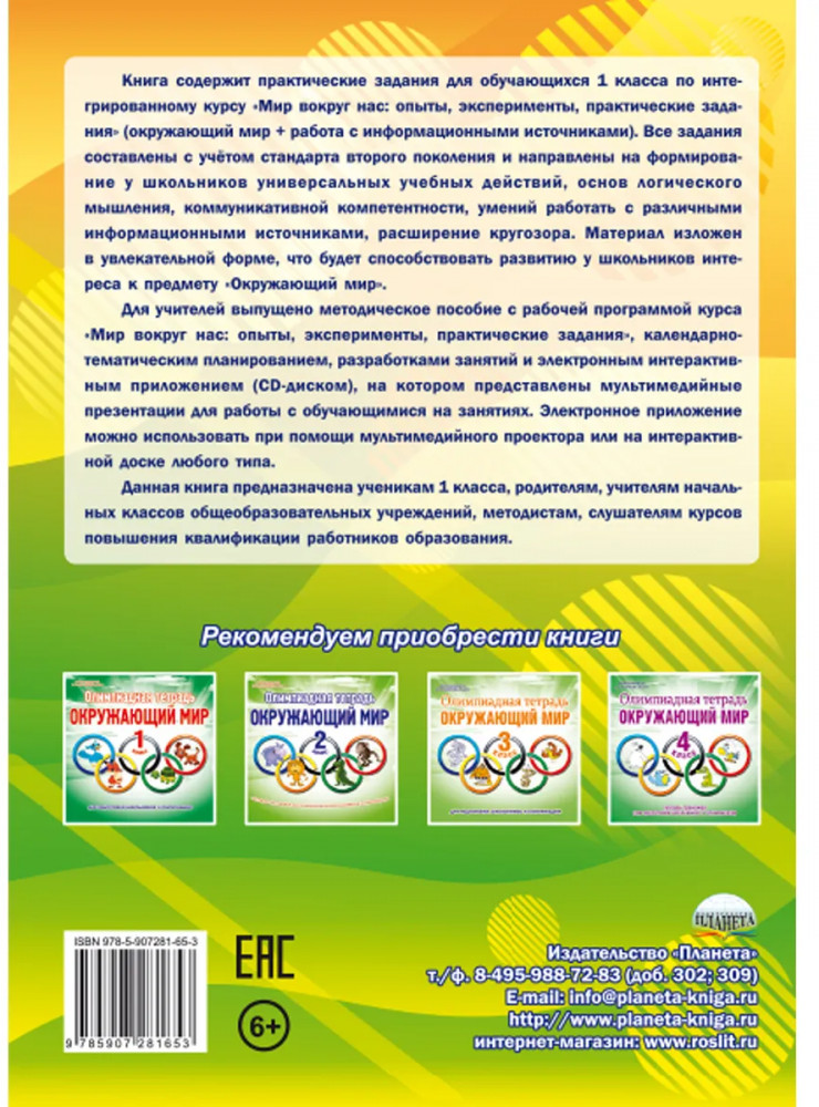 💳 Оплатить за товар можно при получении 🇰🇿 Есть бесплатная доставка по Казахстану от 1 дня 🎁 Копите бонусы с каждой покупки Книга содержит практические задания для обучающихся 1 класса по интегрированному курсу «Мир вокруг нас: опыты, эксперименты, практические задания» (окружающий мир + работа с информационными источниками). Все задания составлены с учётом стандарта второго поколения и направлены на формирование у школьников универсальных учебных действий, основ логического мышления, коммуникативной компетентности, умений работать с различными информационными источниками, расширение кругозора. Материал изложен в увлекательной форме, что будет способствовать развитию у школьников интереса к предмету «Окружающий мир». Для учителей выпущено методическое пособие с рабочей программой курса «Мир вокруг нас: опыты, эксперименты, практические задания», календарно-тематическим планированием, разработками занятий и электронным интерактивным приложением (CD-диском), на котором представлены мультимедийные презентации для работы с обучающимися на занятиях. Электронное приложение можно использовать при помощи мультимедийного проектора или на интерактивной доске любого типа. Данная книга предназначена ученикам 1 класса, родителям, учителям начальных классов общеобразовательных учреждений, методистам, слушателям курсов повышения квалификации работников образования. |