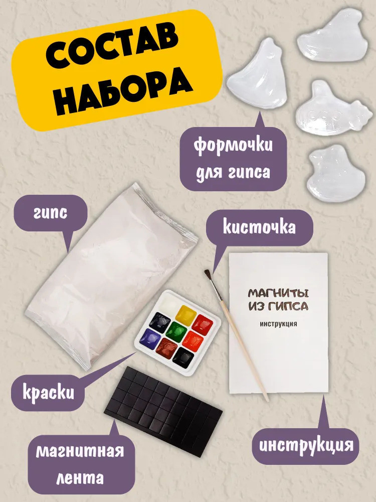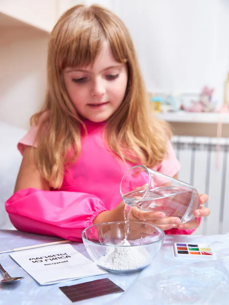 Помогите ребёнку развести и залить раствор в формочки, следуя пошаговой инструкции. Ребёнок с большим удовольствием примет участие в изготовлении магнитов и с интересом раскрасит готовые фигурки.