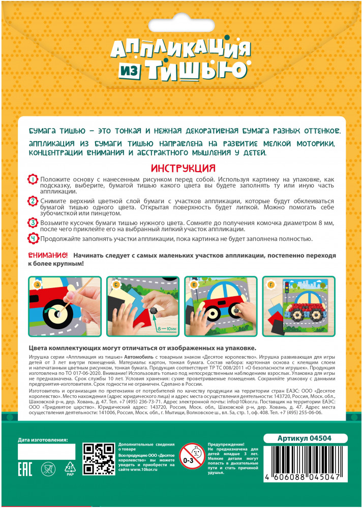 💳 Оплатить за товар можно при получении 🇰🇿 Есть бесплатная доставка по Казахстану от 1 дня 🎁 Копите бонусы с каждой покупки Набор для детского творчества Аппликация из тишью «Автомобиль» состоит из цветной карточки с ярким изображением и листов цветной бумаги тишью. |
