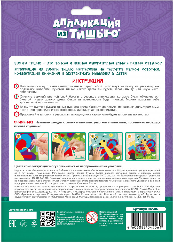 Набор для детского творчества Аппликация из тишью «Бабочка» состоит из цветной карточки с ярким изображением и листов цветной бумаги тишью.