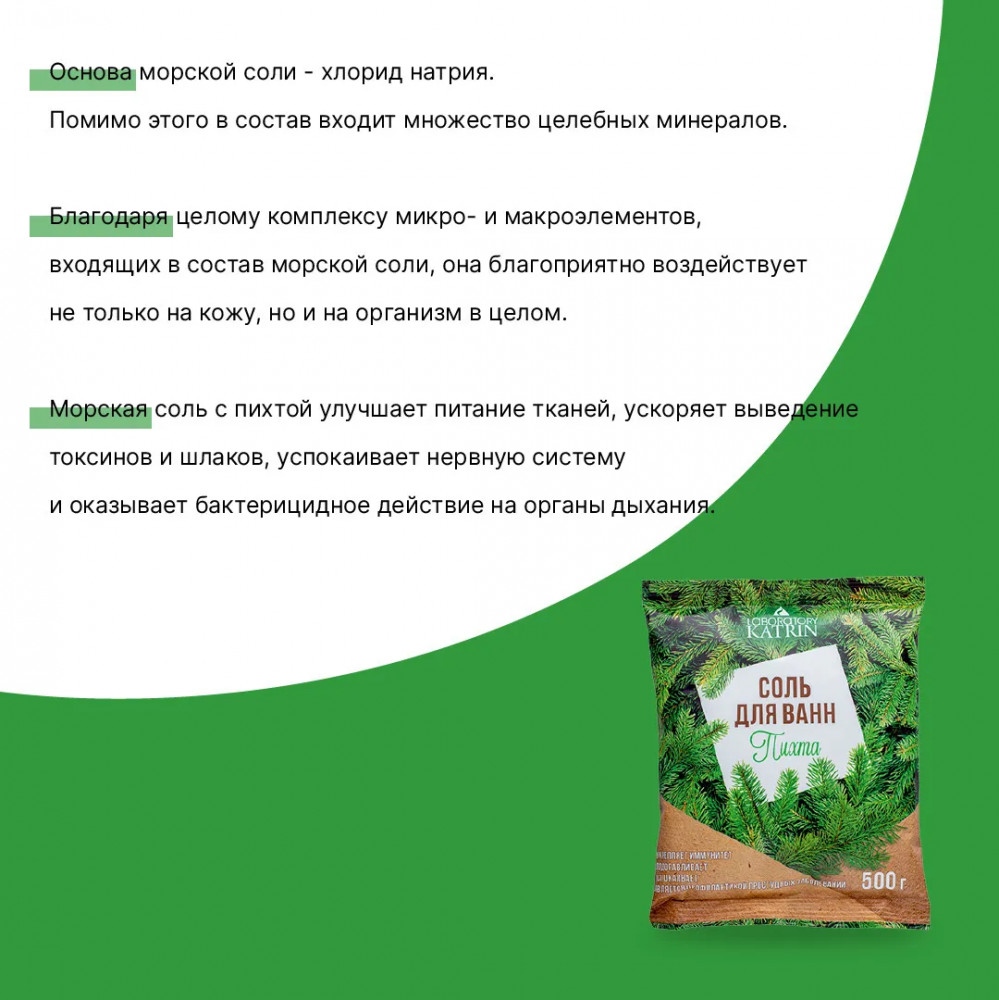 Ядрёный запах пихты. В ванне становится прям как в бане. Супер зелёный цвет у воды, красителя не пожалели. Но на ванне и теле не остаётся. Соль понравилась