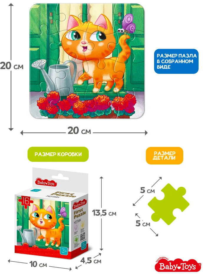 💳 Оплатить за товар можно при получении 🇰🇿 Есть бесплатная доставка по Казахстану 🎁 Копите бонусы с каждой покупки Серия: First Puzzle Соберите красочную картинку из пазла от Baby Toys. Милый котёнок так и ждёт, чтобы с ним поиграли! |