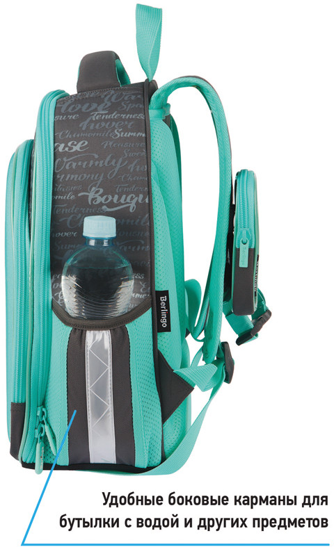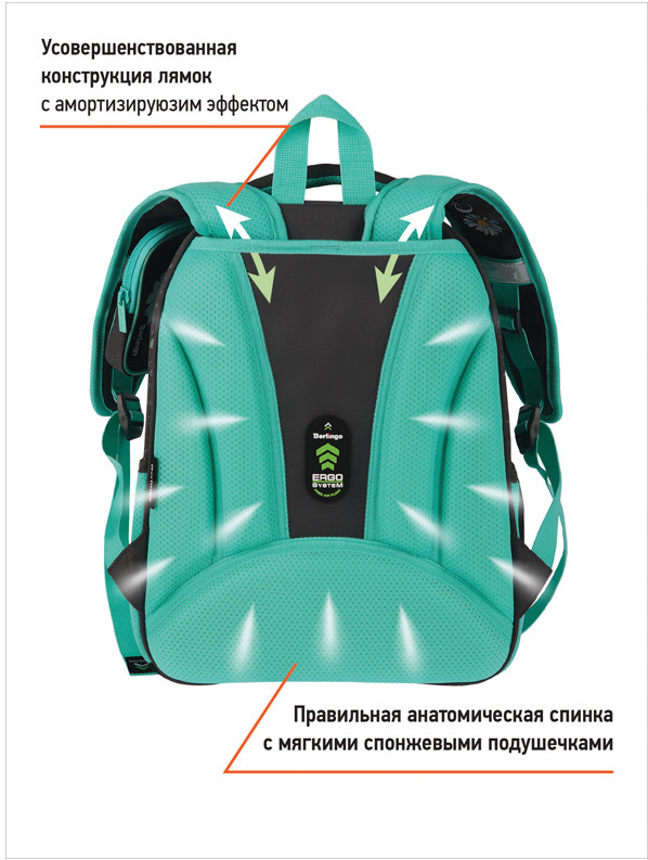 Благодаря анатомической вентилируемой спинке, а также регулируемым по длине лямкам и нагрудному креплению ранец плотно фиксируется на спине ребенка, равномерно распределяется нагрузка и сохраняется правильная осанка. Ранец оснащен усовершенствованной конструкцией лямок с амортизирующим эффектом, которая помогает снизить нагрузку на плечи и спину ребенка. Дно выполнено из водонепроницаемого материала и оснащено пластиковыми ножками для защиты содержимого от влаги. Ранец оснащен плотной ручкой и петлей для подвешивания. Световозвращающие элементы на лямках, передней и боковой частях ранца обеспечивают безопасность в темное время суток. Вес 1 кг.
