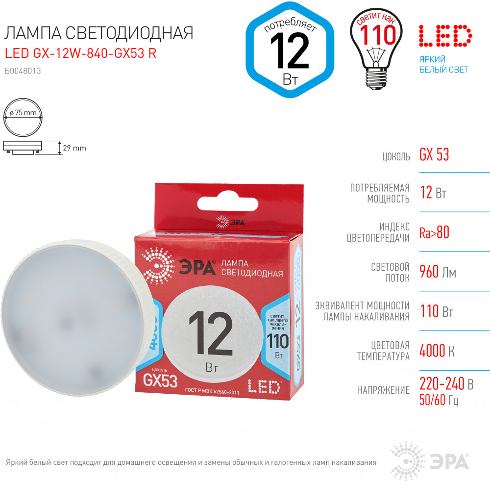 Эра Лампа светодиодная Эра GX-12W-840-GX53+6 Цена Яркость Совместимость